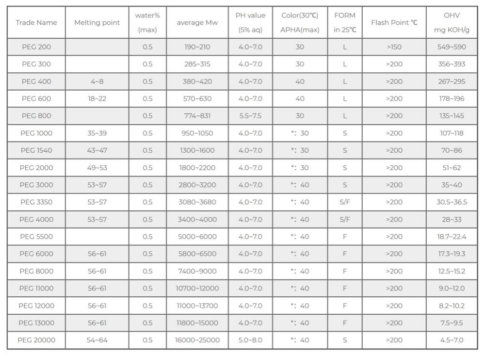 PEG-200 - PEG-600: pieni molekyylipaino, nestemäinen. Niillä on alhainen viskositeetti ja erinomainen vesiliukoisuus, ja niitä käytetään yleisesti erinomaisina liuottimina, pehmittiminä ja kostuttavina aineina, joita käytetään laajalti kosmeettisissa ja farmaseuttisissa nestemäisissä valmisteissa.